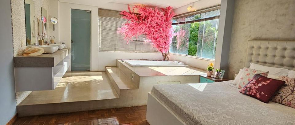 • Suíte master com aproximadamente 40m², ar-condicionado, closet espaçoso com armários fechados, piso em taco, e banheiro com duas duchas e duas pias com aquecimento solar, banheira de hidromassagem (Jacuzzi) para duas pessoas, armários e piso em tecnocimento;